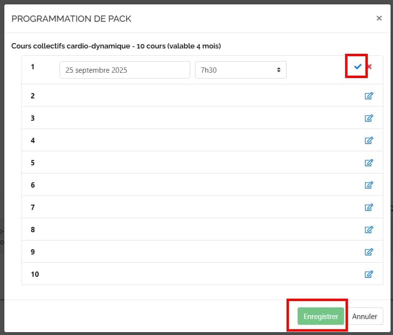 3. Valider le créneau que vous avez sélectionné en cliquant sur la coche bleu puis sur « enregistrer » en dessous
